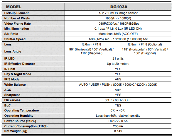 DG103A افضل كاميرات تايوانى فى السوق المصرى العدسة الخاصة بقى 1/ 2.7” CMOS تعمل بجودة 2 Megapixel درجة نقاء صورة 1080P حجم العدسة (2.8mm) بها زاوية رؤيه 96 درجة ومساحة التغطية فى الاضائة الليلية .25m