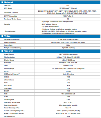 كاميرا تايوانى ip تعمل الكاميرا بجودة صورة 2MP 1080p وبها عدسة 1/2.7″ CMOS زاوية صورة 3.6mm الاضائة الليلية الخاصة بالكاميرا 20m بها خاصية poe وهيا توصيل التيار الكهربا عبر كبل الداتة الخاص بالكاميرا وممكن توصيها بمحول كهرباء 12V وتتحمل العوامل الجوية