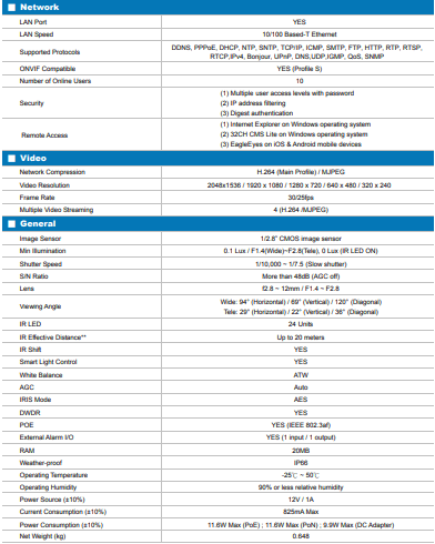 كاميرا خارجى تايوانى ip تعمل الكاميرا بجودة صورة 3MP 1080p وبها عدسة 1/2.7″ CMOS زاوية صورة زوية رؤية زوم ( من2.8mmالى 8mm ) الاضائة الليلية الخاصة بالكاميرا 20m بها خاصية poe وهيا توصيل التيار الكهربا عبر كبل الداتة الخاص بالكاميرا وممكن توصيها بمحول كهرباء 12V وتتحمل العوامل الجوية ip66