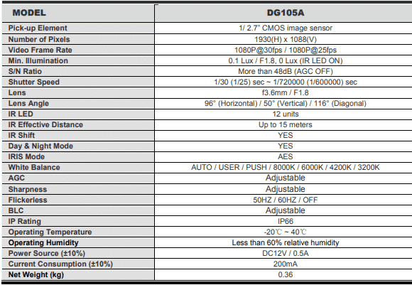 DG105 افضل كاميرات خارجى تايوانى فى السوق المصرى العدسة الخاصة بقى 1/ 2.7” CMOS تعمل بجودة 2 Megapixel درجة نقاء صورة 1080P حجم العدسة (3.6mm) بها زاوية رؤيه ْ70 درجة ومساحة التغطية فى الاضائة الليلية .25m وتتحمل العوامل الجوية IP66