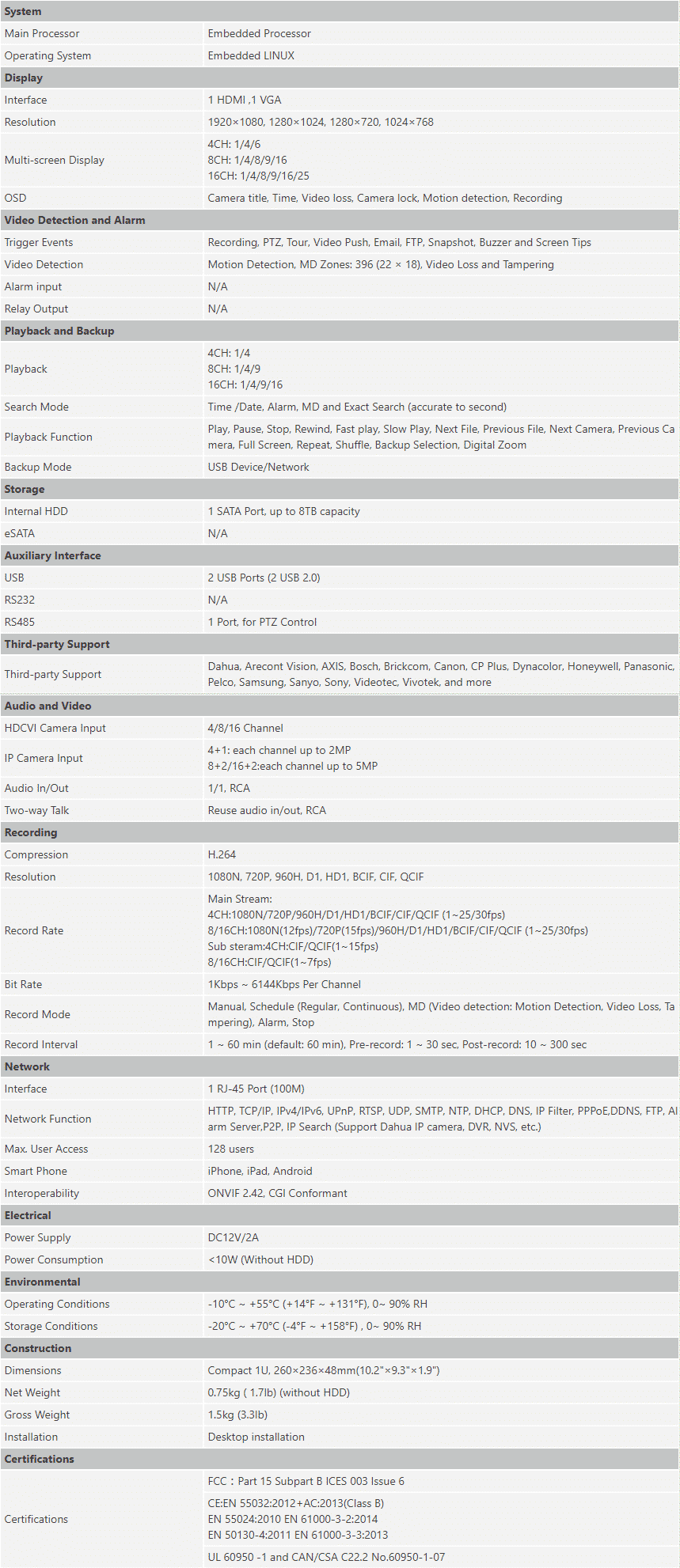 جهاز تسجيل رقمى 4ch NVR ماركت دهوا يتميز جهاز XVR بتشغيل كل انواع الكاميرات HDCVI/ AHD/TVI/CVBS/IP سعة التخزين الخاصة بالجهاز مجهز بعدد واحد هارد 6TB الجهاز مزود بعدد 2 مخرج صورة 1 HDMI 1 VGA بجودة صورة 1080P لضمان نقاء الصورة وتوفير احتياجات العميل ومزود بتشغيل عدد 1 مايك لسماع وتسجيل الصوت بجودة عالية